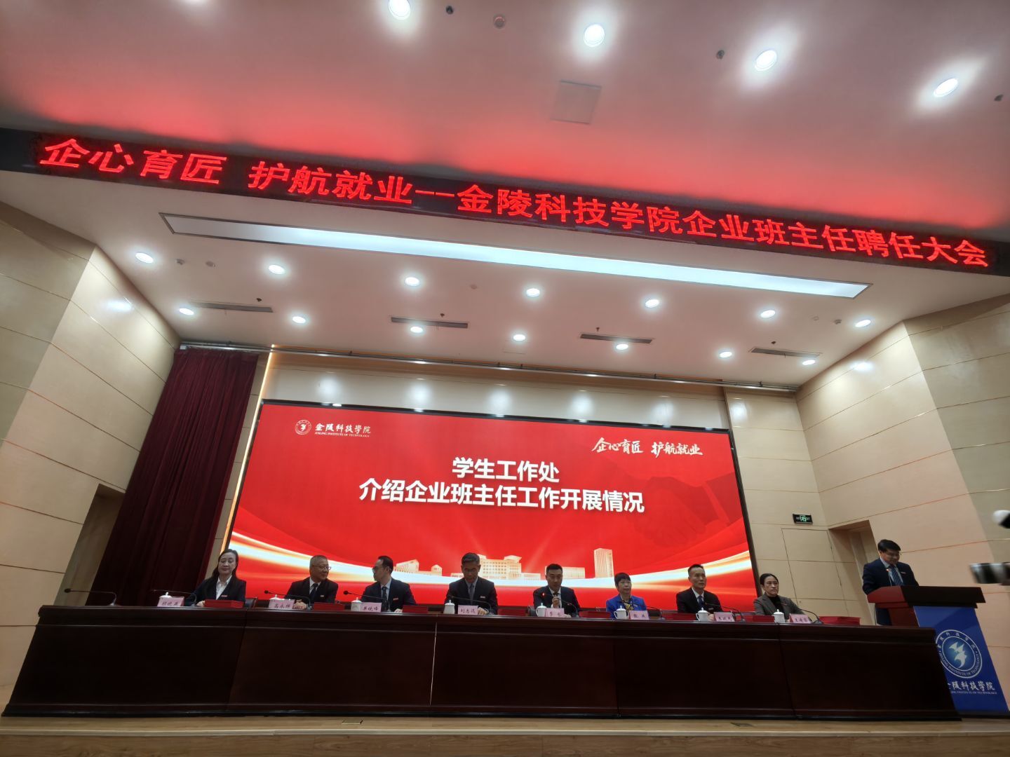 2025年11月26日,金陵科技学院企业班主任聘任大会在金陵科技学院科技楼报告厅举行。江苏dcbox小金库app科技(集团)股份有限公司唐佩、徐敏博、罗涛、孙文雅同志受聘金陵科技学院软件学院企业班主任,并随后在学院组织下,参观金陵科技学院科创空间,参加学院研讨会。